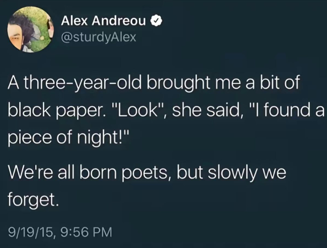 Quick! Catch it Ferocity and the beat of wings You young one who will be once In a lifetime or many, in any case You are So be Not true so much as trying Nor there so much as coming back Might as well call it The place to be It's everything, or anyway, it has to be, What else? Piece of night in your palm, Steal it. Call it stolen, take it with you, eat it on the last train home.